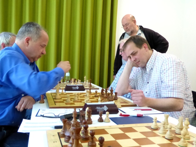 Wie verhält man sich bei einem Gegner ohne DWZ, der direkt an den vorderen Brettern spielt. Abwarten und Tee trinken wäre eine Alternative gewesen. Nicht so wenn Werner antritt. Angriff und Verteidigung sowie die Chancen auf den Matchball wechselten sich ab, beide Spieler nutzten ihre Vorteile nicht, ermüdet reichten sich die Recken einvernehmlich die Hand.