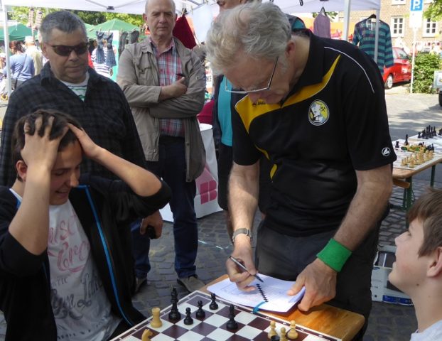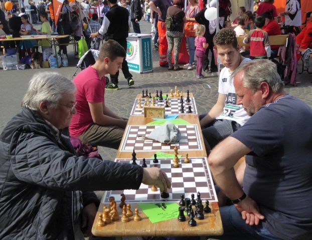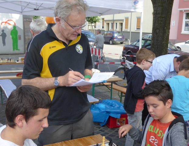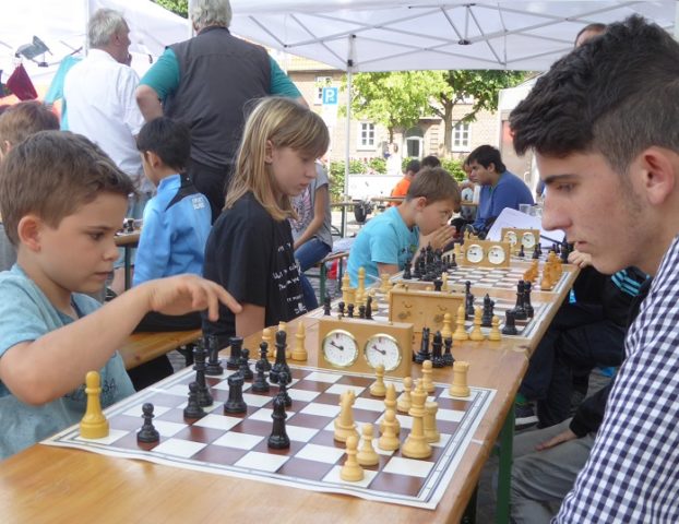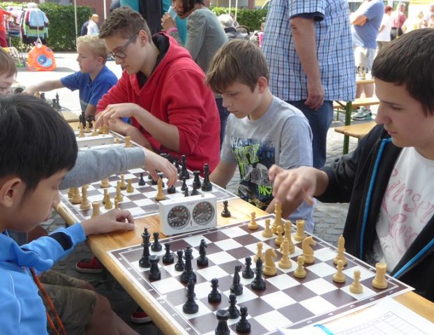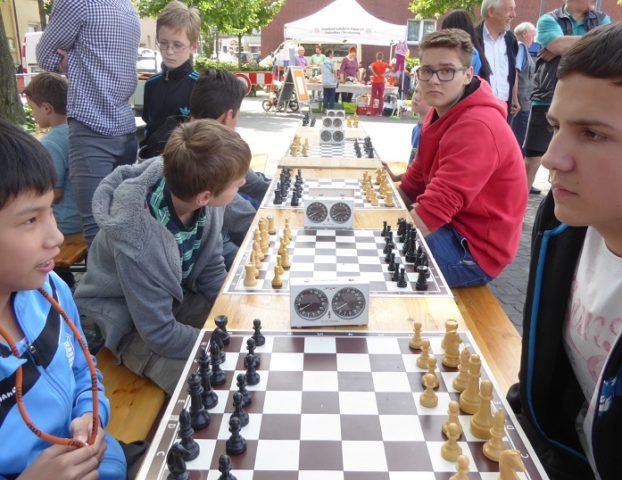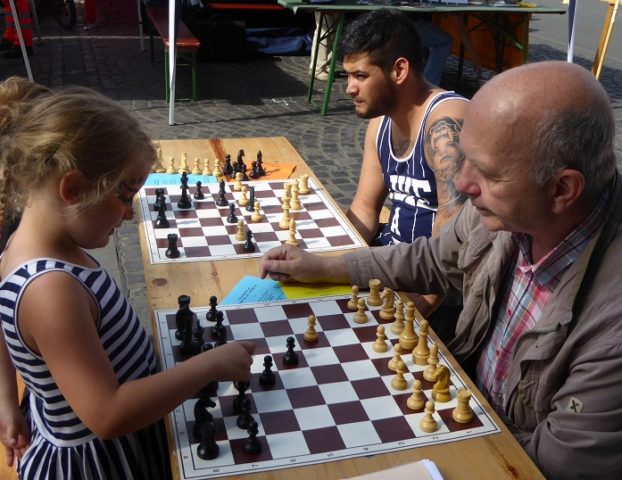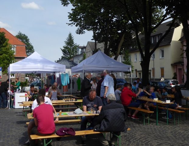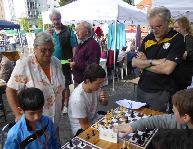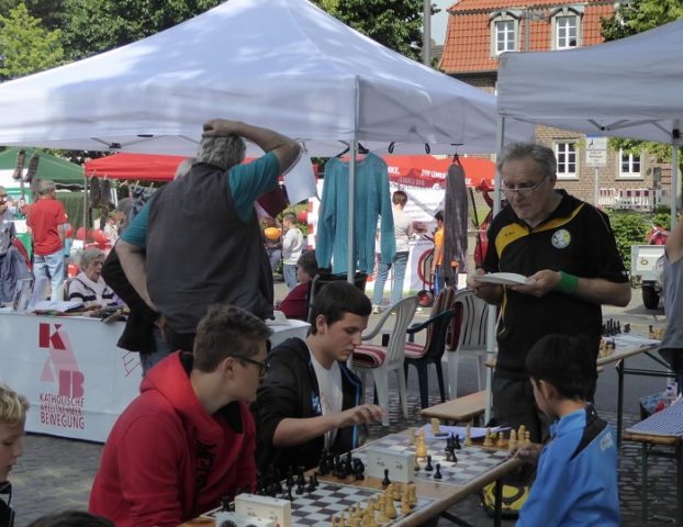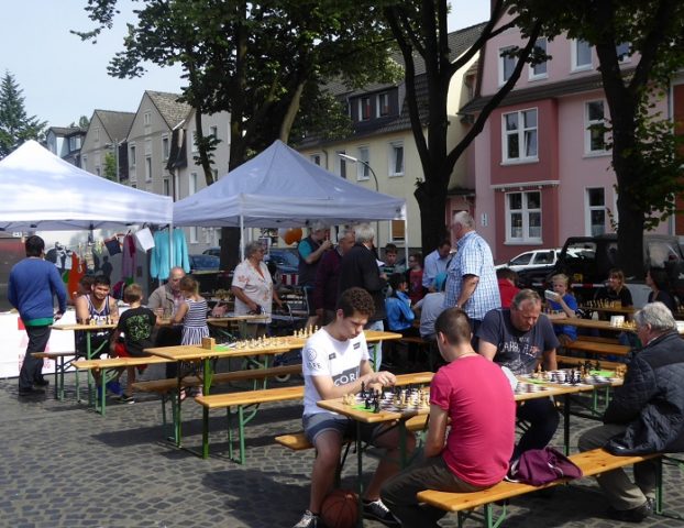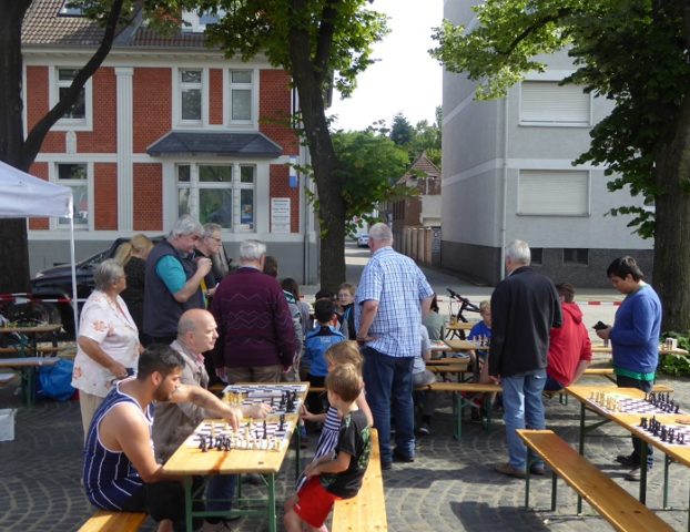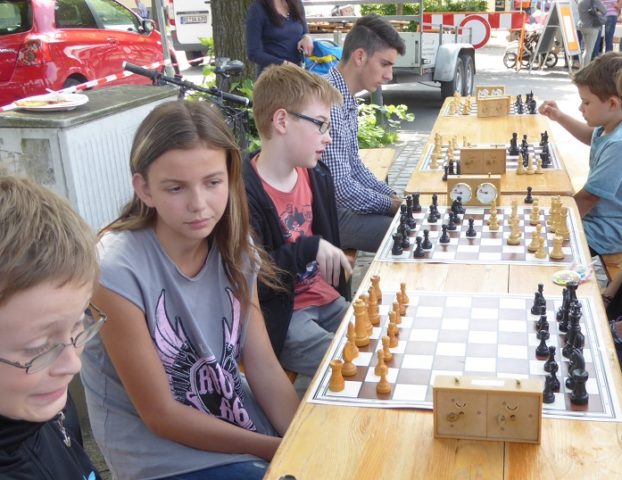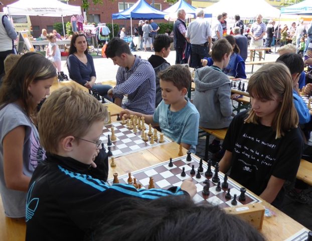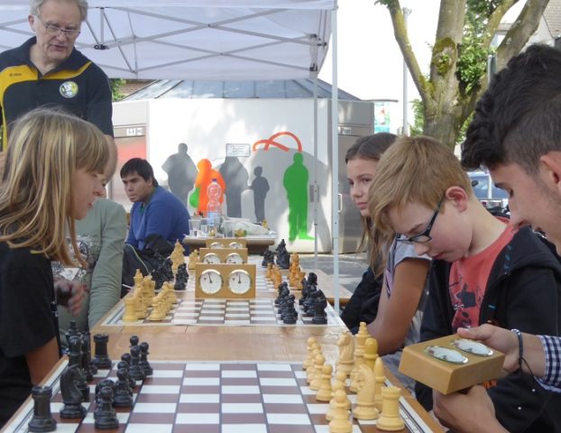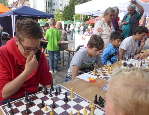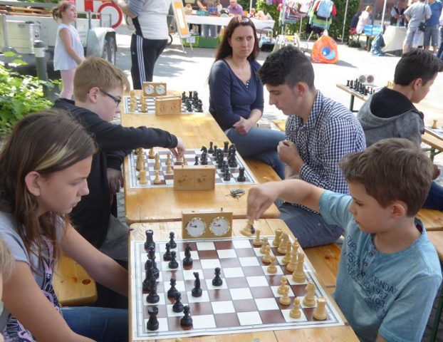 Wie schon im Vorjahr waren wir mit „schwerem Geschütz“ vor Ort. Zehn Bierzeltgarnituren und ein Pavillon gaben uns genug Platz, nicht nur das Schachherz zu erfreuen. Ob Infostand oder Schachaufgaben, ob erste Schritte am Brett oder einfach nur eine Partie – selbst müde gelaufene Besucher fanden bei uns ein schattiges Plätzchen.